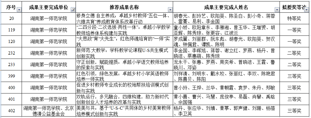 湖南省高等教育教学成果奖每四年评选一次,代表了全省高等教学成果的最高水平。省教育厅根据《关于开展第十三届湖南省高等教育教学成果奖励工作的通知》(湘教通〔2022〕14号),组织开展了第十三届湖南省高等教育教学成果奖评选工作。经单位推荐申报、评审委员会择优遴选、异议受理和省教育厅审定,共评选出第十三届湖南省高等教育教学成果奖420项,其中特等奖20项、一等奖100项、二等奖121项、三等奖179项。我校是全省唯一一所学院级别获特等奖的高校。