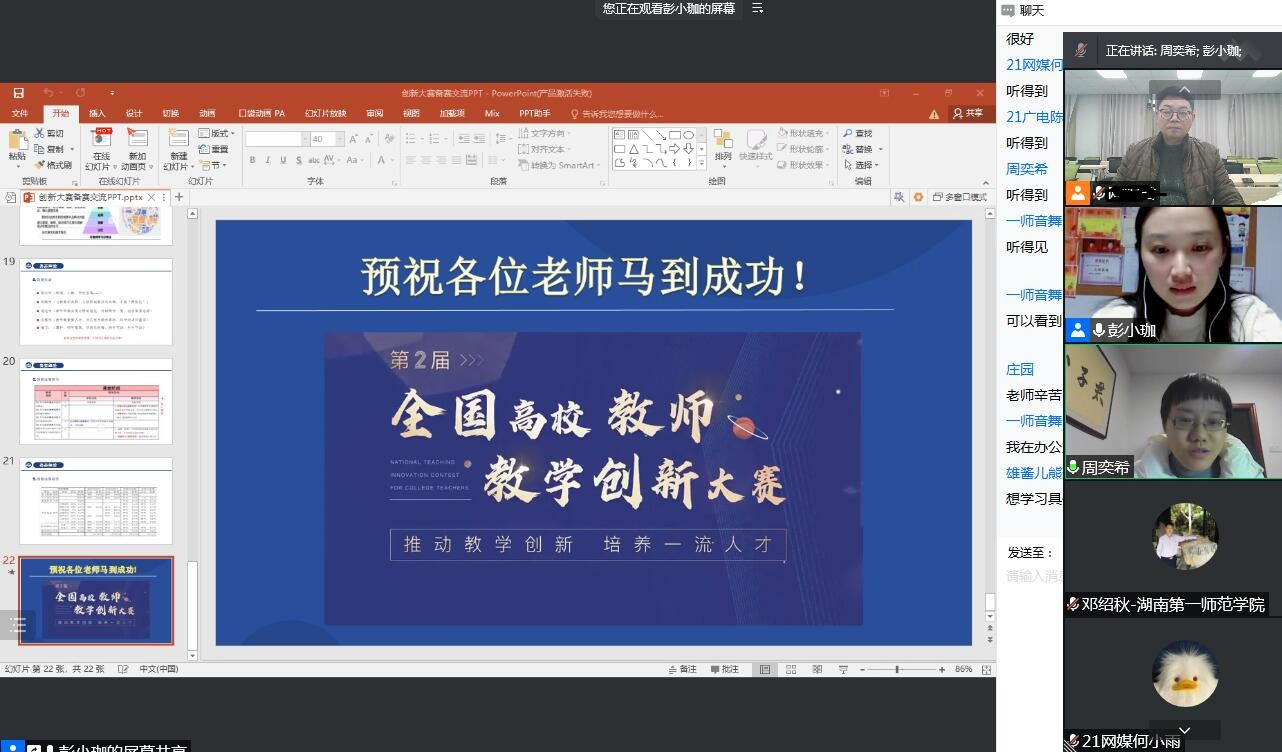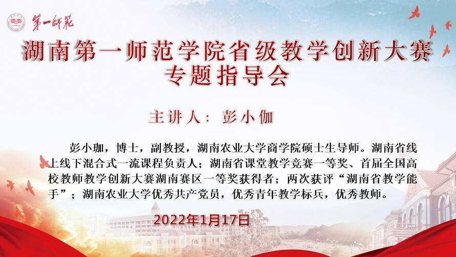 1月17日,我处特邀荣获湖南省首届高校教师教学创新大赛一等奖的湖南农业大学彭小珈副教授为我校教师做了一场题为“聚焦教学创新,打造一流人才”的线上专场指导会。会议由教务处副处长廖小芒主持。