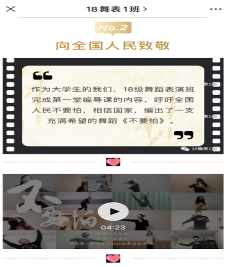 音乐舞蹈学院的洪瑶峰老师教授《动作分析与编创(二)》,通过小组合作、分别指导带领学生创作,把作品用短视频的方式呈现出来,并在班级公众号中编辑专门的推文,在腾讯视频等媒体播放。
