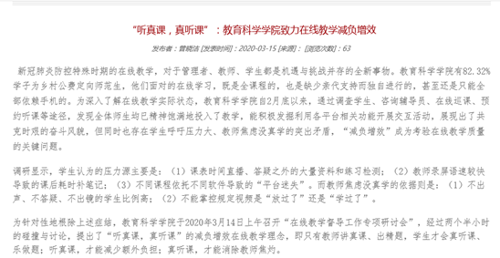 教育科学学院召开“在线教学督导工作专项研讨会”,提出 “听真课,真听课”的减负增效在线教学理念,采取措施引导教师减负担,见成效。