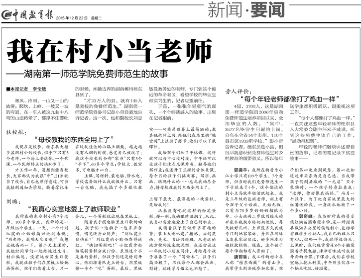 “每个人都像打了鸡血一样。”一直关注这些年轻老师的桂东县人大常委会副主任邓子成说,听到这些免费生谈自己的工作,“感动得想哭”。