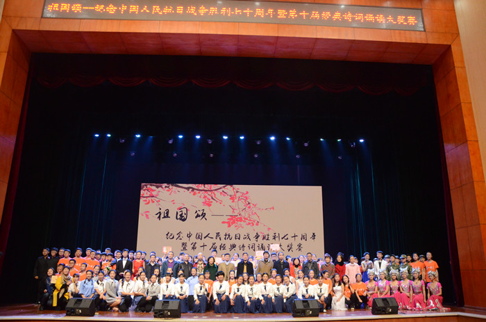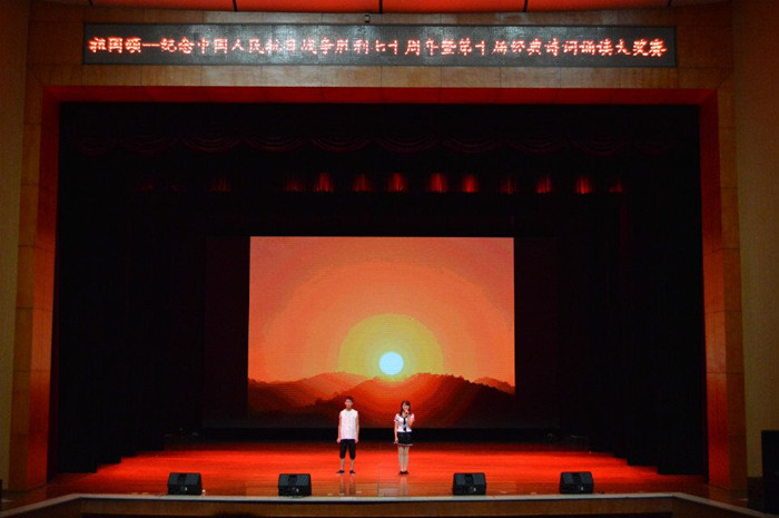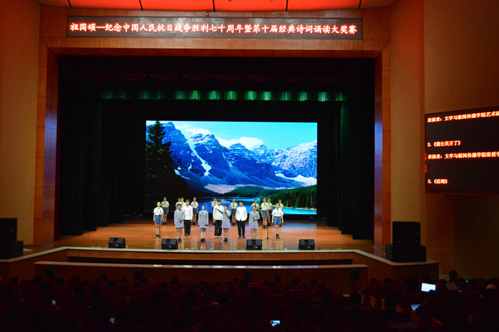 比赛在合唱《我和我的祖国》中展开。参加决赛的选手们以诵读、舞蹈、舞台剧等形式,贯穿历史的时空,将战争的悲壮与残酷、英雄们的忠诚与勇敢演绎得淋漓尽致。其中,《一个都不许死》、《和平宣言》和《中华少年》采取朗诵与表演相结合的形式,演绎出了当时中国人民顽强抗战、决不妥协的伟大精神。《与妻书》以双人诵读的方式为观众再现了烈士林觉民对妻子的一网深情和他对祖国誓死效忠的决心。《采蒲台的苇》用感人的语言,描述了革命抗日战争中游击战士的英勇豪迈。《活埋》以南京大屠杀为背景,选手们用精湛的表演向各位英雄烈士表达了自己的崇高敬意。本次经典诗词诵读比赛现场气氛热烈,同学们热情高涨。最后全体演员在《歌唱祖国》的歌声中,表达了对祖国的热爱和美好生活的向往。