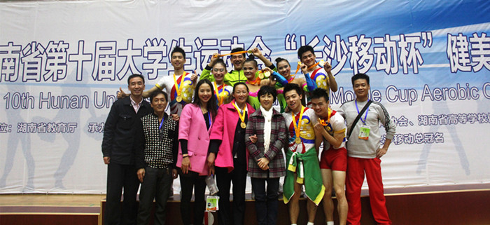 我校健美操队在领队朱建伟副院长,总教练王京琼教授,教练员罗婕、单舜、肖琴老师的带领下,参加了全部10个项目的比赛,斩获8金1银,以绝对优势夺得团体总分第一名。