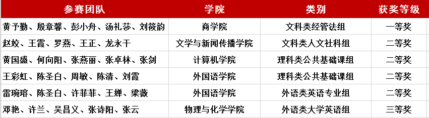 来自全省49个高校的181个竞赛团队,进行了激烈的同台竞技。我校商学院黄予勤老师团队荣获文科类经管法组一等奖(全省仅4项),文学与新闻传播学院赵姣老师团队、计算机学院黄国盛老师团队、外国语学院王彩虹老师团队、雷琬瑢老师团队荣获二等奖;物理与化学学院邓艳老师团队荣获三等奖。本次竞赛我校遴选的6支竞赛团队全部获奖,1个一等奖、4个二等奖、1个三等奖,我校获得优秀组织奖,成绩排名省属学院类高校第一。