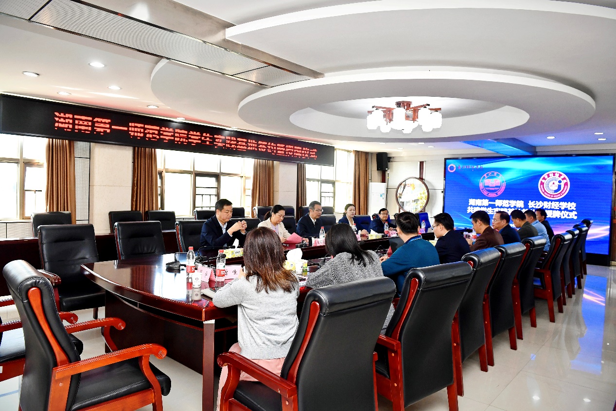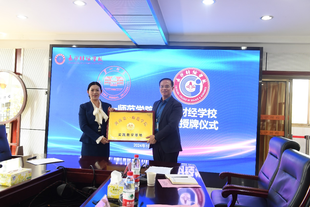 我校教务处处长张娴、长沙财经学校伍卓林校长代表双方签署实践教学基地共建协议并授牌。