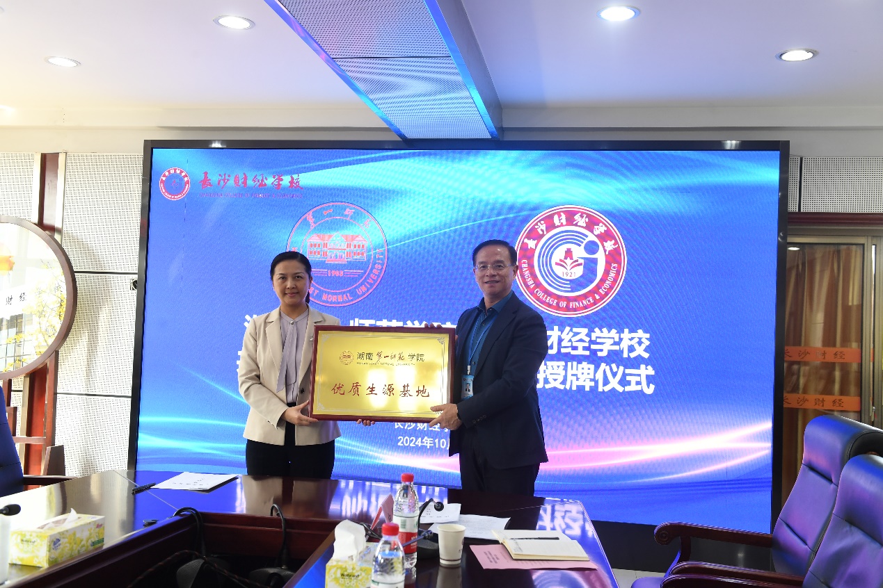 我校招生就业处长殷章馨、长沙财经学校校长伍卓林代表双方签署优质生源基地共建协议并授牌。