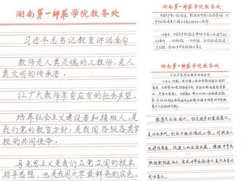 书写比赛活动期间,老师们一幅幅精美的书法作品陆续展现出来,男老师们的作品端庄大气,女老师的作品清秀俊逸。本次书写比赛不仅彰显了党员教师的书法艺术,充分展示了党员教师的风采,也激发了党员教师学习、摘抄习近平总书记关于高等教育与教师教育“习语金句”的热情,抒发了忠于党忠于人民教育事业的满腔热情,推动了支部学习教育活动的深入开展。