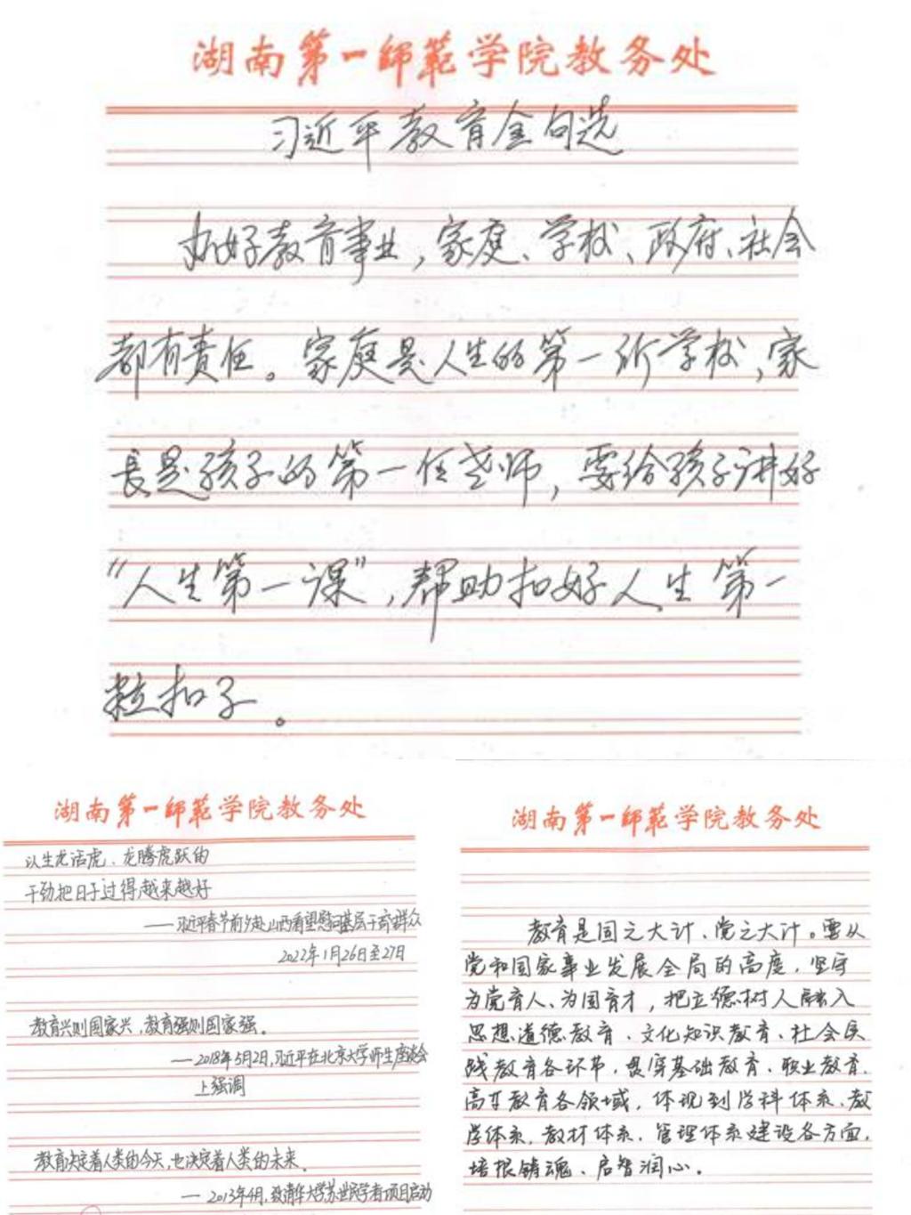 为进一步加强“两学一做”学习教育,增强“四个意识”、提升党员干部素养,推进机关精神文明建设,弘扬中华传统文化,深入学习习近平总书记关于高等教育与教师教育的重要论述,坚持立德树人,把为学、为事、为人统一起来,当好学生成长的引路人,教务处党支部开展学习习近平总书记关于高等教育与教师教育的“习语金句”硬笔书法摘抄比赛,创新机关党支部的理论学习形式,坚定为党育人、为国育才、立德树人的信念。
