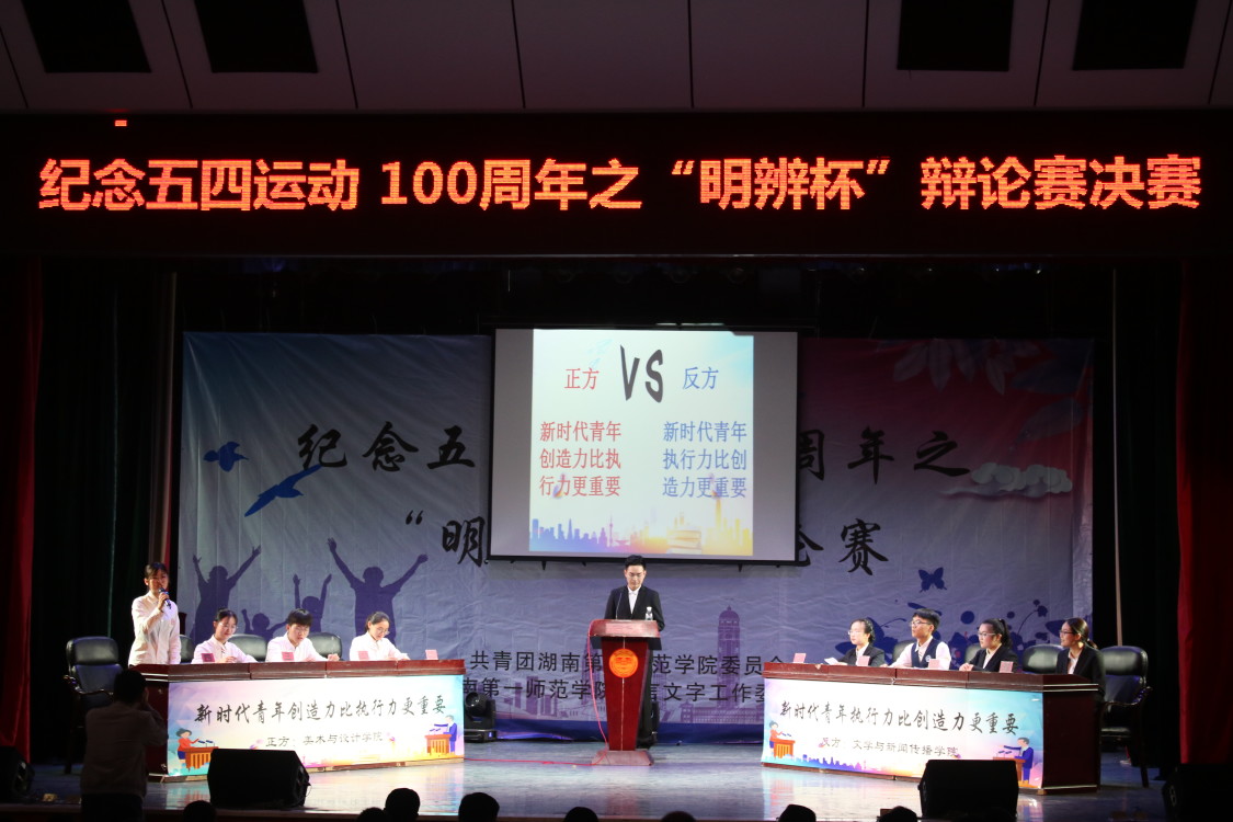 辩论赛由校团委、校语言文字工作委员会联合主办,今年3月开始启动,历时2个月,旨在隆重纪念五四运动100周年,组织引领我校广大青年学生继承和弘扬以“爱国、进步、民主、科学”为核心的五四精神,引导大家深入思考青年运动的时代主题,将自己的人生理想同国家的前途命运紧密结合,为实现中华民族伟大复兴的中国梦贡献青春力量。全校10个二级学院学生辩论队先后参加了小组赛、淘汰赛、晋级赛和半决赛的角逐。最终,美术与设计学院辩论队、文学与新闻传播学院辩论队胜利会师决赛。